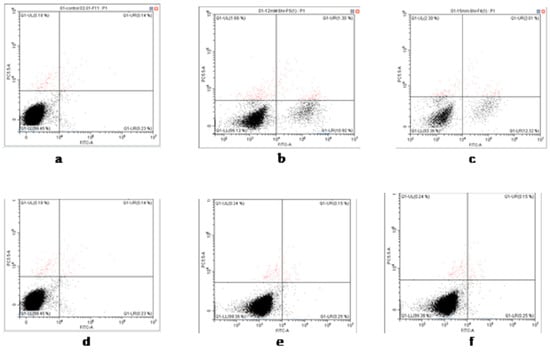 Examples of flow cytometry analysis of apoptosis of painted lady caterpillar cells (a = control, b = 12 mM t-BHP and c = 15 mM t-BHP) and Turkestan cockroach cells (d = control, e = 12 mM t-BHP and f = 15 mM t-BHP).