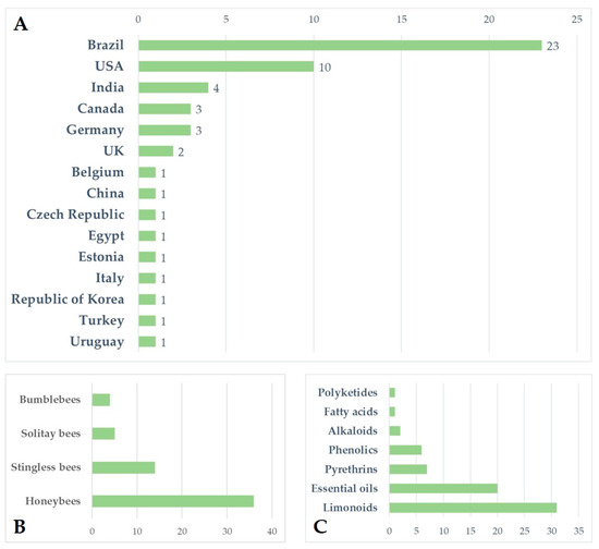 | Apis mellifera | Pellitorine extracted from Piper tuberculatum | laboratory (L) and field | ingestion and topical | larvae, adults | high mortality at the highest rates | Brazil | 2003 | [105] ** |