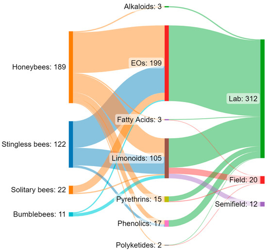 The only field study [122] was conducted in Brazilian melon (Cucumis melo L.) fields, investigating the visitation rates of Halictus spp. (Halictidae) after treatments with azadirachtin. Halictus Latreille is a wide genus of bees that includes a scale of different social behaviours from solitary and semi-social to social species. Since the species was not specified in Tschoeke et al. [122], we reported this in the solitary bees category. Halictus bees showed reduced visitation intensity after treatment with a neem-based insecticide.