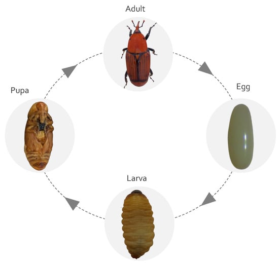 RPW is a holometabolous insect, and the life cycle passes through four distinct stages; namely egg, larva, pupa, and adult (Figure 1). The female has a high fecundity, and it may deposit as many as 200–250 eggs during its lifespan. Depending on the type of host and environmental conditions, the RPW could produce eggs four times annually. The details of the weevil morphology and life cycle have been studied by many authors [8,9,10,11,12,13].