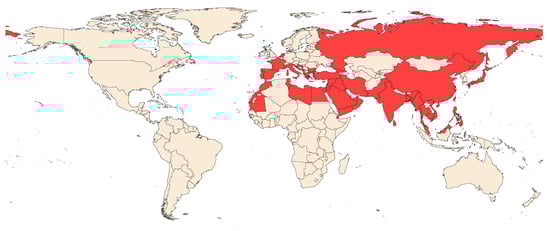 R. ferrugineus affects key agricultural and ornamental palms, such as date palms, coconut palms, Washingtonia palms, oil palms, and Canary Island palms. Its native range is thought to comprise Southeast Asia and Melanesia [2]; it began affecting the Gulf region in the late 1900s, later spreading to many other parts of the world [15]. The RPW has a great capacity for flying, reaching up to 50 km per day [17]; in addition, the ‘concealed boring’ part of its life cycle greatly contributes to its invasive potential, with the RPW mainly spreading through the movement of infested plant materials [18]. The weak quarantine procedures for ornamental plant material movement across countries, as well as slowness in classifying the RPW as a global threat, have facilitated its rapid spread [19]. Due to the movement of infested palms and palm offshoots for the production of dates or landscaping, the weevil has, over the last 30 years, invaded 49 countries in Asia, Europe, Africa, and the Caribbean [3] (Figure 2).