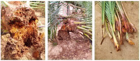 Although new technologies are being developed for early infestation detection [20], it is often the case that by the time visible signs of infestation appear, damage to the plant is already severe, rendering any attempts to save the tree futile (Figure 3). Damage symptoms on date palm (Phoenix dactylifera) have been described in detail [21,22]; the main symptoms include the oozing of brownish viscous fluid together with frass (palm tissue excreted by feeding larvae) that has a typical fermented odor, drying of outer leaves and fruit bunches, drying of infested offshoots, topping of the trunk in the case of severe and extensive tissue damage, and the presence of adults and pupae at the base of the fronds and on the ground nearby [13,23].