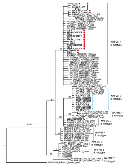 Maximum likelihood tree for mitochondrial cytochrome oxidase I gene sequences of the NAFME haplotype groups, reconstructed using RaxML. Whitefly haplotypes NAFME 2, 3, and 5 grouped most closely with reference sequences belonging to the North Africa–Middle East (NAFME) clade. One thousand bootstrap iterations were carried out, and statistical support values (>60%) were placed at the major nodes.