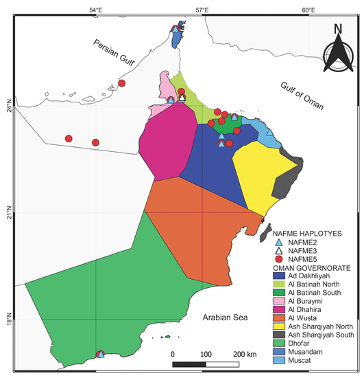 The geographic distribution map of the NAFME haplotypes identified within Oman and reference sequences determined for other locations in the Middle East were drawn using the geographic coordinates for each sample. Maps of administrative divisions were downloaded from the online geographic information systems platform DIVA-GIS (https://www.diva-gis.org/, accessed on 1 March 2023), and occurrence records of NAFME haplotypes were compiled in QGIS v3.8.1 (QGIS development team, 2021) using the ‘Biological Records Tool’ plugin.