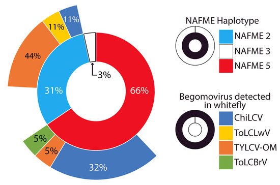 Frequency of Bemisia tabaci NAFME haplotypes (inner chart layer) and begomoviral species (outer chart layer) detected in whitefly extracts.