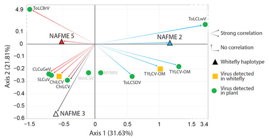 Correspondence analyses between whitefly haplotypes NAFME 2, 3, and 5 and begomovirus species detected in whitefly and plant samples. Red arrows show positive associations between begomovirus species and whitefly haplotype NAFME 5; blue arrow indicates positive associations between begomovirus species and NAFME 2 haplotype. Black arrow shows the association between the single begomovirus species detected in symptomatic plants infested by the NAFME 3 haplotype.