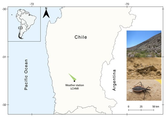 Map of Chile, South America, showing the area of Mepraia spinolai collection and the location of the Weather Station at Las Chinchillas National Reserve, CONAF, Coquimbo Region. On the right side: view of a collecting site (top), M. spinolai nymph (middle), and adult female (bottom).