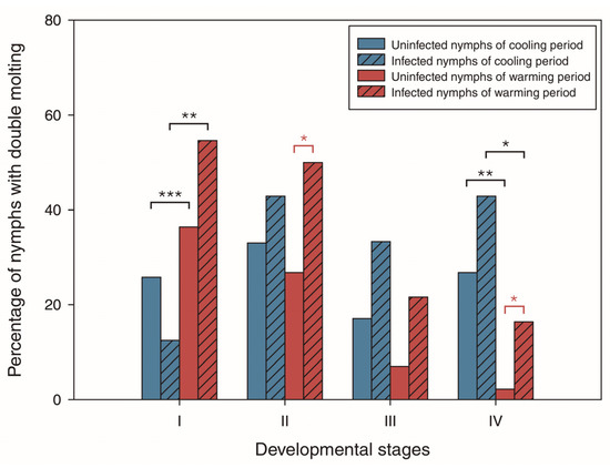 Separated analyses by developmental stages showed that first-instar nymphs, regardless of their infection status, exhibited a larger proportion of double molting in the warming period compared to those from the cooling period (infected: 54.6% vs. 12.5%, respectively, χ2 = 8.45, p = 0.004; uninfected: 59.1% vs. 25.8%, respectively, χ2 = 11.92, p < 0.001; Figure 2). On the other hand, fourth-instar nymphs—regardless of their infection status—exhibited a larger proportion of double molting in the cooling period compared to those from the warming period (infected: 42.9% vs. 16.4%, respectively, χ2 = 4.75, p = 0.029; uninfected: 26.8% vs. 2.2%, respectively, χ2 = 10.82, p = 0.001; Figure 2). No other infected or uninfected nymphs of remaining instars (second and third) showed statistically significant differences between the probability of double molting depending on climatic period of collection (p > 0.05).