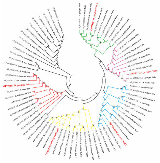 The insect Toll receptor is a key effector of the Toll pathway, recognizing extracellular specific ligands and triggering intracellular cascades to maintain the normal Toll signaling pathway in the immune response and ensure that insects resist pathogen infection and continue normal development [34]. Herein, five Toll receptor genes of M. persicae were cloned, which is less than the number of Toll-related genes identified in other insects, ranging from 7 in Acyrthosiphon pisum to 14 in Bombyx mori [35,36]. Sequence analyses indicated that three typical conserved domains of the Toll family were found in five MpToll amino acid sequences, and a similar conservation has been found in Toll sequences in B. mori and Lymantria dispar [37,38]. Different domains may play distinct roles, with the TIR domain being a key site of interaction with intracytoplasmic adaptor protein MyD88 to enable intracellular signaling [39], while the LRRs domain was thought to be particularly suitable for interactions between proteins [40]. Phylogenetic analysis showed that the five protein sequences formed a distinct clade and clustered together with the corresponding Tolls from D. melanogaster, B. mori, A. gambiae, and other insects, indicating that Tolls are evolutionarily conserved [37]. These results suggest that these five MpToll genes are typical Toll family members, and their functions may be conserved among the orthologs in each cluster.