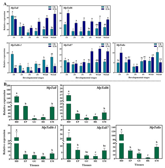 (A) Specific expression profiles of MpToll genes at different developmental stages. The peacock blue bar indicated the relative expression just birth or molting (<1 h) for the corresponding instar, and the dark blue is 12 h after birth or molting. Significant differences are shown in lowercase letters for the former and in capital letters for the latter (p < 0.05, Tukey). (B) Specific expression profiles of the five MpToll genes in different tissues of adults; the letters above the bars indicate significant differences (p < 0.05, Tukey). Developmental stages: first-instar (1N), second-instar (2N), third-instar (3N), and fourth-instar (4N) nymphs, wingless (WlAD), and winged (WdAD) adults. Tissue samples: head (HD), epidermis (EP), gut (GU), hemolymph (HE), and embryos (EM) from adults.