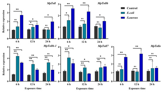 The mRNA expression profiles of MpToll genes after challenge with E. coli or S. aureus. Sterile water group was used as a control. Significant differences between the treatment and control groups were determined using Student’s t-test (*, p < 0.05, **, p < 0.01).