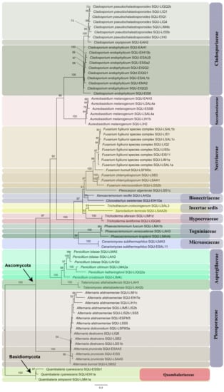 The isolated fungi were identified using the ITS barcode. A total of 74 fungal isolates were recovered from the dubas-bug-infested leaves, representing 31 fungal species belonging to 16 genera of 10 fungal families. The maximum likelihood phylogenetic tree is depicted in Figure 1, where each species is highlighted in a specific color shade with their respective family.