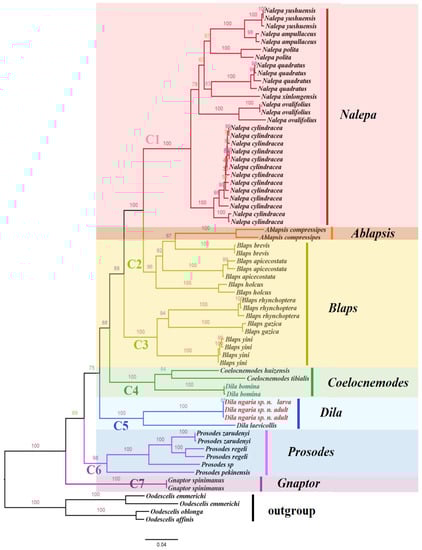 - Li, X.M.; Tian, J.; Fan, J.J.; Ren, G.D. Systematic Review of the Genus Nalepa Reitter, 1887(Coleoptera, Tenebrionidae, Blaptinae, Blaptini) from the Tibetan Plateau, with Description of Six New Species and Two Larvae. Insects 2022, 13, 598. [Google Scholar] [CrossRef]