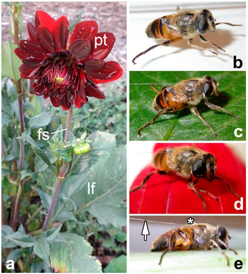 The plant Dahlia pinnata (a) and the fly Eristalis tenax in the experiments on different test substrates (b–e): glass (b), the adaxial (upper) side of the leaf (c), the adaxial side of the petal (d), and the stem (e). In (e), arrow points to a hair attached dorsally to the fly thorax using a droplet of molten beewax (asterisk). Abbreviations: fs, flower stem; lf, upper leaf; pt, petal (actually, ray flower).