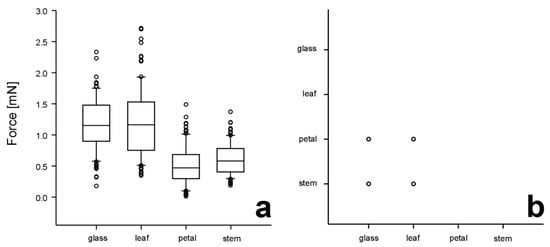 Traction force values of 10 individuals of E. tenax obtained on glass and different plant surfaces are presented in Figure 4a. Since the force generated by different insect individuals varied greatly even on glass (1.18 ± 0.38 mN, n = 100), we analysed the obtained data using two-way ANOVA, considering both the insect individual and the substrate as factors. The flies showed significantly different forces (p < 0.001, two-way ANOVA). Both factors, insect individuals and substrates, significantly influenced the force values (individuals: F9,391 = 37.565, substrates: F3,397 = 213.416, both p < 0.001). The similarly higher forces were registered on reference glass and the leaf surface (Figure 4). These force values significantly differed from much lower ones obtained on petals and stems, which did not differ significantly from each other (Figure 4).