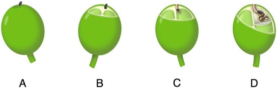 A minimum of 60 marked berries per treatment for DOT, 7-DAT, and 14-DAT were dissected to determine beetle positioning (A/B or C/D) and if alive, dead, or absent. If a CBB was found alive but had not yet entered the parchment and bean, positioning was considered A/B alive. An A/B dead CBB would not have entered the endosperm (bean) and may or may not have exhibited symptoms of B. bassiana infestation. An A/B absent CBB created an entrance hole, typically on the flower-end of the berry, but was not physically present in the hole. If a CBB entered the parchment and damaged the bean, positioning was considered C/D regardless of whether the beetle was dead, alive, or not located. Dissections were conducted as soon as possible and no later than 24 h after berry collection.