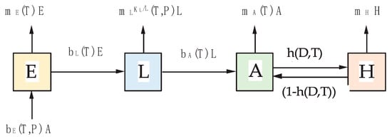 Our population model consists of four stage variables: E—egg stage, L—larval stage, including pupal stage, A—active adult mosquitoes, H—adult mosquitoes in diapause (Figure 1). Furthermore, we only allowed the proportion of surviving individuals of one stage to have the possibility to change into the next stage.