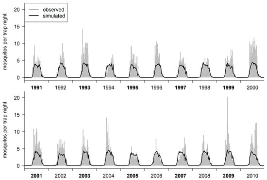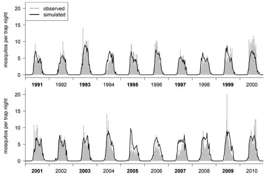This final model was able to reproduce inter-year variability in terms of the abundance of the Cx. pipiens/restuans mosquitoes, as well as in terms of the different yearly trends. However, it overestimated mosquito abundance in years with very low capture rates, and, thus, with potentially low abundance (1994, 2005, 2007), while underestimating the abundance for some years with very high mosquito capture rates (2000, 2009).