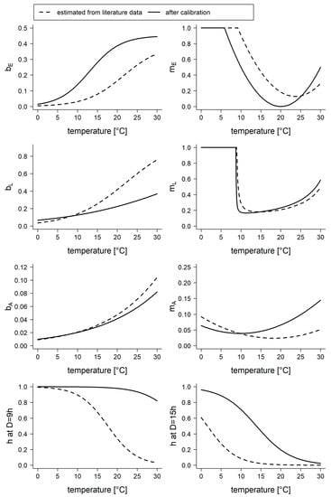 The highest modification was found for h, the transition rate to and from the diapausing stage. In the final model, the function for h implied that under short day conditions, most mosquitoes were in the diapausing stage, which was nearly independent from the temperature. At long daytime lengths, on the other hand, temperature had a high impact on the transition between the stages A and H.
