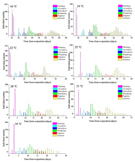 A total of 20 pairs of adults were reared at each temperature of 16, 19, 22, 25, 28, 31, and 34 °C, and the above steps were repeated to induce oviposition. The oviposition substrate was placed in the Petri dish at 8:00 every day and taken out at 20:00. The number of eggs was counted under the microscope, and the oviposition substrate was placed into an empty Petri dish with a diameter of 12 cm and placed into a microenvironment incubator with the temperature corresponding to their parents. The eggs were sprayed with 1 mL of water every day to prevent desiccation. Observations were made every 4–6 h to record the time of hatching. The hatched individuals were carefully picked out with a soft brush, and the number of hatchlings was calculated by recounting the remaining eggs. The time of hatching was recorded.