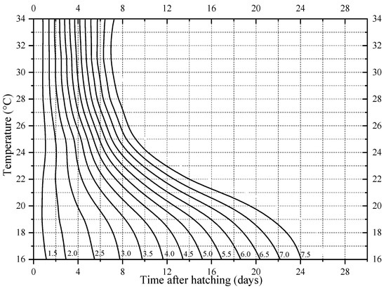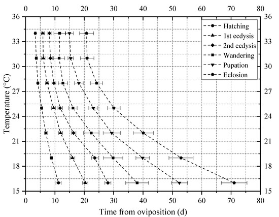 In addition, the standard deviation of developmental events under the same constant temperature in Table 1 gradually increases, suggesting that the number of individuals of different developmental events under the same constant temperature in Figure 3 gradually disperses. The mean value and standard deviation of the time required for the six developmental events of N. rufipes under the seven constant temperatures were plotted with post-hatching time as the X axis and temperature as the Y axis on the isomorphen diagram (Figure 4).