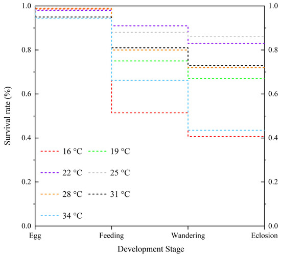 The survival rate of N. rufipes at 16 °C and 34 °C was lower at 40.65% and 43.52%, respectively, while the survival rate of N. rufipes at 22 °C and 25 °C was higher at 83.10% and 85.78%, respectively (Figure 7), consistent with the intrinsic optimum temperature of 24.15 °C obtained by the Optim SSI models. The survival rate of the eggs at each constant temperature was very high, except for a small number of eggs that did not hatch at 31 °C and 34 °C. Death rates were highest during the feeding stage at 16 °C and during the feeding, post-feeding, and pupal stages at 34 °C.