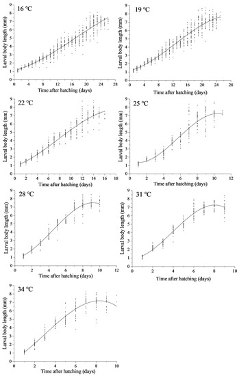 The variation in larval body length of N. rufipes under the seven constant temperatures is shown in Figure 8. Regression analysis was conducted with larval body length as the dependent variable and the time after hatching as the independent variable, resulting in a simulation equation for the change in larval body length over time (Table 4). The higher the temperature, the faster the increase in larval body length observed.