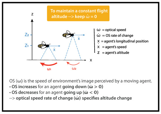 For a flying agent, objects scroll across its visual field (Figure 1). The optical speed of the ground () is the ratio between the relative linear speed of the agent (x) and its altitude above the ground (z).