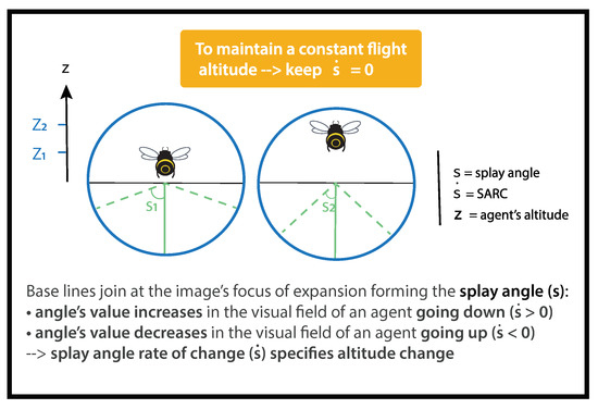 A loss of altitude 0 gives rise to an increase in splay angle 0 (Figure 2), whereas an altitude gain 0 results in a decrease in splay angle 0 (Figure 2). Following Gibson’s reasoning, the splay angle S is a low-order variable correlated to altitude, and SARC is a high-order variable specifying a change in altitude. Thus, to keep the same altitude, an agent has to negate any change in splay angle, i.e., to maintain 0 (See [32] for further details).