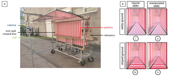 The side walls, floor, and ceiling were textured with a printed pattern of red and white stripes (Figure 3A). On the ceiling and floor, the pattern was printed on one side of a plastic sheet (Figure 3(Bi)), while the other side was uniformly mat white (Figure 3(Biii)). These reversible sheets allowed us to provide greater or lesser difficulty in accessing optical speed (OS). With OS being generated by the scrolling of a point on a visual field, it is more accessible in contrast-rich visual environments. Thus, the striped plastic sheet offered, thanks to its strong contrast, an easy access to OS. The white sheet offered a difficult access to OS. It was, however, sufficient for the bees to perform a ground-following task [35,36]. In order to allow video recording, the striped pattern was reproduced with gelatin filter stripes on the left wall, which consisted of red and white stripes oriented perpendicularly to the insect’s flight path (See [32] for further details).