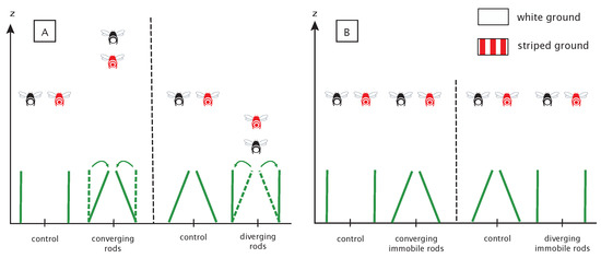 In a seminal experiment, Heran and Lindauer observed that bees were unable to fly above a lake with a perfectly smooth surface [41], i.e, providing no access to OSRC. Wooden planks positioned perpendicular to the trajectory of the bees enabled them to do so. This result was said to demonstrate the primary role of OSRC in the control of altitude. With reference to the present study, it is worth mentioning that the addition of the wooden structure also allowed the bees to benefit from SARC. However, the contribution of Heran and Lindauer is remarkable and in the continuity of their findings, numerous studies have shown that bees are able to perform a ground-following task relying only on OSRC [17,18,20], which until now has seemed to be necessary for the achievement of this task. As an extension of our study, it would be interesting to explore to what extent SARC alone is sufficient to perform a ground-following task. Serres et al. [20] designed a specific configuration depriving the bees of any texture on the ground and ceiling of a tunnel and, as a consequence, from OSRC. Heran and Lindauer observed that bees were unable to fly through the tunnel. We hypothesized that, as we had investigated in the present study, the addition of rods materializing the splay angle would allow bees to detect SARC and, therefore, to perform the ground-following task successfully.