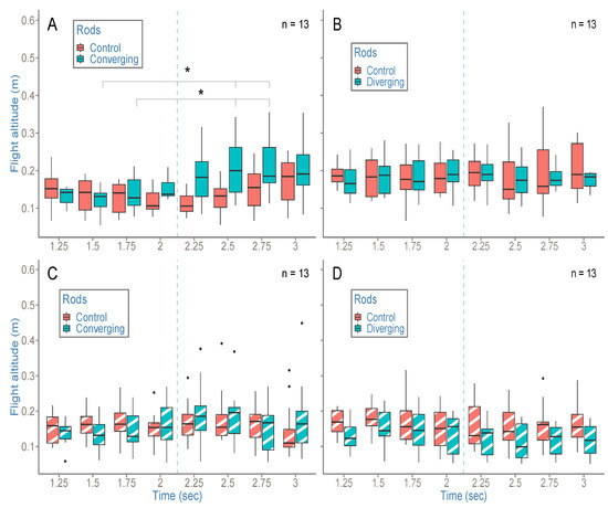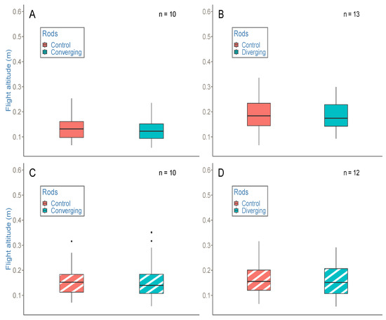 Altitude of bees subject to a change in splay angle value. The four experimental conditions were (A)—converging condition above white ground; (B)—diverging condition above white ground; (C)—converging condition above striped ground; (D)—diverging condition above striped ground, compared to their respective control conditions (parallel or narrow). The rods were set as converging or diverging before bees entered the tunnel. In each condition, bees maintained the same altitude for the whole of their flight through the tunnel (Figure 7; for all comparisons p > 0.01). Outliers are represented by solid circles. Randomly selected flights were analyzed in each condition, respecting a ground-following criterion (see Section 2.2.4). Raw trajectories from the trials are visible in Figure S3.