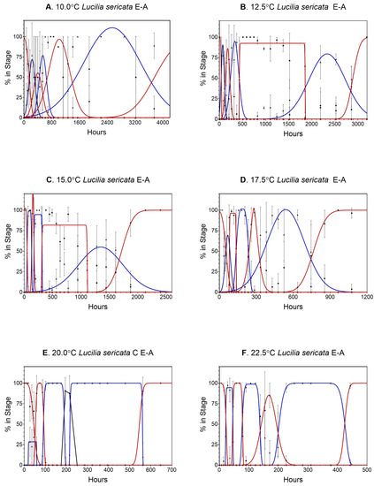 The following supporting information can be downloaded at: https://www.mdpi.com/article/10.3390/insects14040315/s1, Table S1: Development data for Lucilia sericata (from Excel); Table S2: Datasets and statistical analysis summary of Lucilia sericata nonlinear regressions for percent in stage by temperature; Table S3: Datasets and statistical analysis summary of Lucilia sericata nonlinear regressions for 50% stage transition by temperature; Table S4: Development data for Phormia regina; Table S5: Datasets and statistical analysis summary of Phormia regina nonlinear regressions for percent in stage by temperature; Table S6: Datasets and statistical analysis summary of Phormia regina nonlinear regressions for 50% stage transition by temperature.