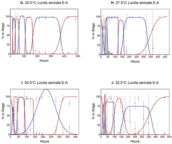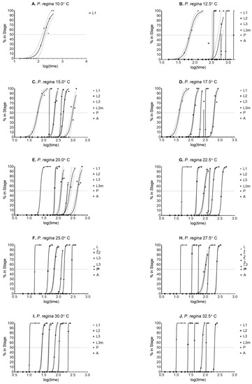 (A–E). Probit analysis curves used to determine 50% of the transition population for Phormia regina at 10.0–32.5 °C (A–J, respectively). Confidence intervals are represented by dotted lines.