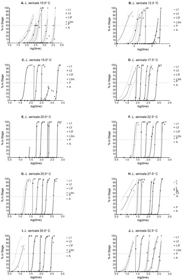 Probit analysis curves used to determine 50% of the transition population for Lucilia sericata at 10.0–32.5 °C (Figure 2A–J, respectively). Confidence intervals are represented by dotted lines.