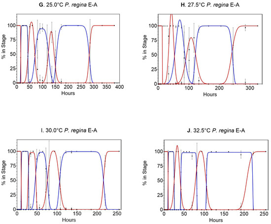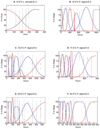 As previously discussed, the goal of this experiment was to determine the distributions of stage transitions by temperature for each of 6 transitions. With 11 temperatures and 6 transitions we needed to model 66 relationships for each species. We used 2 regression procedures. First, to determine the appropriate transition distributions, we used TableCurve 2d, version 5.01 (SYSTAT Software Inc., San Jose, CA, USA, http://www.sigmaplot.com/products/tablecurve2d/tablecurve2d.php), accessed on 1 July 2022. and Prism, version 6.02 (GraphPad Software, Inc., La Jolla, CA, USA, http://www.graphpad.com/scientific-software/prism/). Here, we fit one of 4 functions (specifically, a regressed proportion (percentage) in stage versus time, at each temperature tested). Variables were y = proportion in stage, x = time (degree days), and a, b, c, and d = regression coefficients. The equations used were the following: