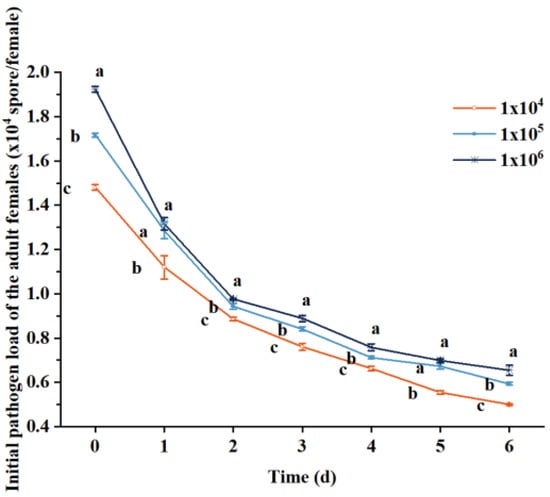 Initial pathogen load of the female adults of S. guani under different concentrations of B. bassiana spore suspensions. Different letters above the bars indicate significant differences (mean ± SE, n = 3 in each treatment).