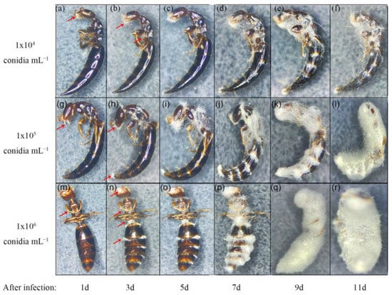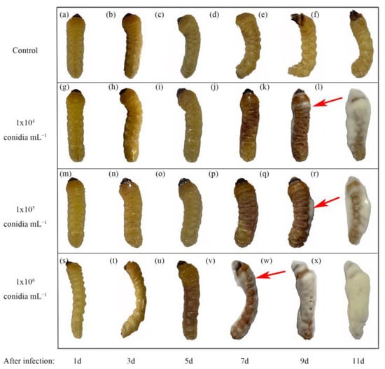 The infection of M. alternatus larvae under different concentrations of B. bassiana spore suspensions (the red arrow indicates the growth of B. bassiana hyphae on the surface of M. alternatus larvae) (a–f: growth of hyphae on the body surface of M. alternatus larvae at the control; g–l: growth of hyphae on the body surface of M. alternatus larvae at 104 conidia mL−1 B. bassiana suspension; m–r: growth of hyphae on the body surface of M. alternatus larvae at 105 conidia mL−1 B. bassiana suspension; s–x: growth of hyphae on the body surface of M. alternatus larvae at 106 conidia mL−1 B. bassiana suspension).