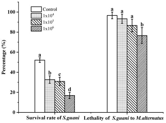 The survival rate of S. guani and lethality of S. guani to M. alternatus at different concentrations of B. bassiana spore suspension. Different letters above the bars indicate significant differences (mean ± SE, n = 30 in each treatment, p < 0.05).