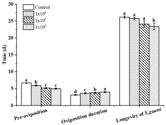 Under different concentrations of treatment, the pre-oviposition (F3,116 = 97.669, p < 0.01) was less than the control and the oviposition duration (F3,116 = 44.422, p < 0.01) was higher than the control. Pre-oviposition and oviposition duration of S. guani was significantly different. Although the longevity of S. guani (F3,116 = 3.509, p < 0.05) in various treatment was lower than the control, the longevity was statistically different only when it was treated with B. bassiana at 106 conidia mL−1 (F3,116 = 3.509, p < 0.05). As the concentration increased, the pre-oviposition, oviposition duration, and longevity of S. guani at various concentrations were: 104 conidia mL−1 (5.93 ± 0.09 d; 3.63 ± 0.09 d; 25.83 ± 0.75 d), 105 conidia mL−1 (5.17 ± 0.11 d; 3.77 ± 0.09 d; 24.12 ± 0.85 d), and 106 conidia mL−1 (5.00 ± 0.18 d; 4.00 ± 0.19 d; 23.41 ± 0.68 d) (Figure 4). Compared with the control, the pre-oviposition of S. guani was shortened by 0.74 d, 1.50 d, and 1.67 d, respectively, and the oviposition duration of S. guani was prolonged by 0.63 d, 0.77 d, and 1.00 d, respectively. The longevity of S. guani was shortened by 0.57 d, 2.22 d, and 2.93 d, respectively (Figure 4).