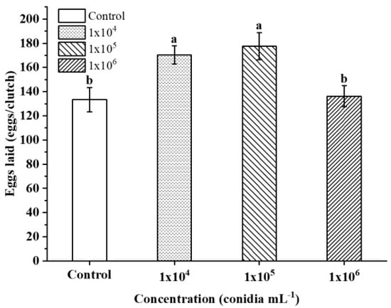 Eggs laid off S. guani under different concentrations of B. bassiana spore suspension. Different letters above the bars indicate significant differences (mean ± SE, n = 30 in each treatment, p < 0.05).