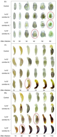 Infestation of pathogens against offspring of S. guani under different concentrations of B. bassiana spore suspensions. The red circle indicates that the larva has died. ES: egg of S. guani; LIL: late instar larval; ML: mature larval.