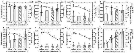 The performance of immature offspring of S. guani under different concentrations of B. bassiana spore suspensions. The mean development rate and survival rate of immature offspring of S. guani. (A) ES: egg of S. guani; (B) EIL: early instar larval; (C) LIL: late instar larval; (D) ML: mature larval; (E) SML: spanning mature larval; (F) PC: pupa cocoon; (G) whole generation and survival of the offspring of S. guani; (H) sex ratio and body weight per female of the offspring of S. guani. Different letters above the bars indicate significant differences (mean ± SE, n = 30 in each treatment, p < 0.05).