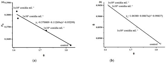 Given the concentration threshold in this experiment (104–106 conidia mL−1), according to the linear regression equations y1 = 0.57809 − 0.12269x (r2 = 0.95299) and y2 = 1.04308 − 0.0867x (r2 = 0.99837) which show that the value of θ decreased, PR and δ increased as the concentration increased (Table 1). This indicates that the antagonism between B. bassiana and S. guani increases. It takes less time for S. guani to kill and paralyze their hosts, but uniform hosts are less efficient. S. guani will shorten the duration of the host’s paralysis and a deadly period when confronted with B. bassiana, and will prevent their growth for the better use of resources provided by the host in the face of a large host prey (Figure 9).