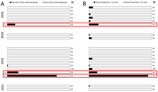 Colonies CA and CB were deemed to be likely instances of recent queen change. Two of these colonies had moderate rates of drones that were not sons of the queen (CA = 12.5%; N = 5/40 drones, and CB = 17.4%; N = 8/46 drones), while in the final colony, most drones had genotypes inconsistent with being the queen’s sons (CC = 78.3%; N = 36/46 drones). This is because all drones in these colonies that were inconsistent with being the offspring of the inferred queen (based on worker genotypes) were instead consistent with a single second mother, and the two inferred mothers per colony were consistent with a mother-daughter queen turnover. The size distribution of drones in these colonies was not suggestive of worker-laying (Figure 2B,C).