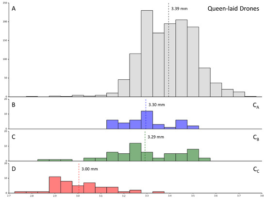 Histograms of the head width of drones used in this study. Dashed lines indicate the mean of each distribution. (A)—The head size distribution of all drones from queenright colonies in this study whose genotype indicated they were sons of the queen. (B,C)—The head size distribution of drones from colony CA and CB, respectively. The mean head size is >3.2 mm, indicating that workers are not reproducing in this colony. (D)—The head size distribution of drones from colony CC. The mean head size is <3.2 mm, indicating that workers are reproducing in this colony.