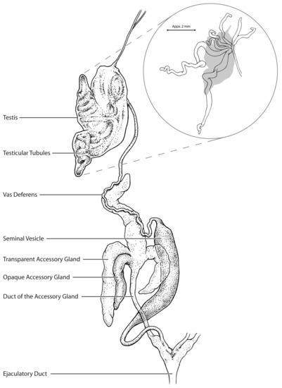 - Leopold, R.A. The role of male accessory glands in insect reproduction. Annu. Rev. Entomol. 1976, 21, 199–221. [Google Scholar] [CrossRef]