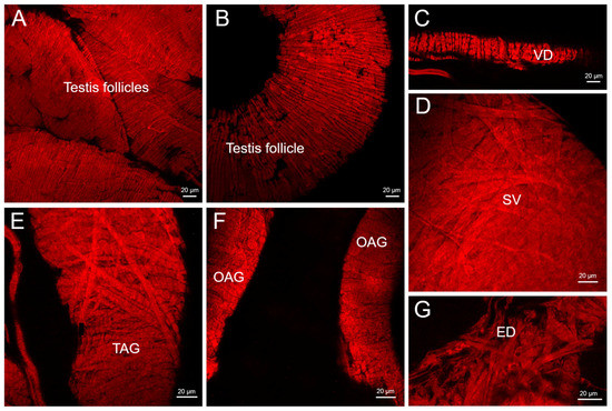 All the structures of the male reproductive system (Figure 1) were covered in layers of muscle fibers, as shown by the phalloidin staining of F-actin (Figure 2). The testis was an ovoid structure lined by a collagenous membrane that enclosed the seven testicular follicles, two of which were longer than the others (Figure 1). The follicles of the testis were surrounded by slender muscle fibers (1.5–3 µm diameter for the smaller follicles and 4–6 µm in diameter for the larger follicles) that encircled each of the follicles (Figure 2A,B). Similarly, the muscle fibers (3–5 µm in diameter) were arranged in a circular pattern surrounding the vas deferens (Figure 2C). The muscle layers of the seminal vesicle formed a crisscross pattern of larger diameter muscle fibers (7 µm in diameter) (Figure 2D) as was also evident for the transparent accessory glands (Figure 2E). The opaque accessory glands had muscle layers that more resembled those seen in the follicles, i.e., in a circular pattern (Figure 2F), whereas the ejaculatory duct had large diameter muscle fibers (7 µm in diameter; Figure 2G) that created a dense and complex crisscross pattern.