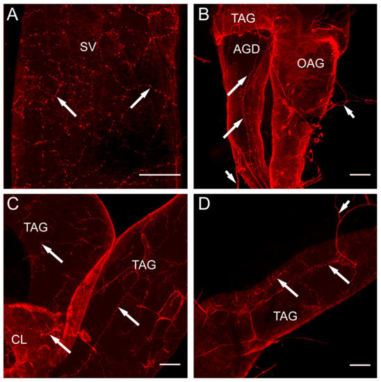 The nerve processes displaying the FLI were found distributed over all the structures of the male reproductive system except for the testis (Figure 3). Numerous immunoreactive processes and blebs were found over the entire seminal vesicle (Figure 3A). Figure 3B–D illustrate the nerves immunoreactive for the FLPs arising from the trunk nerves (abdominal nerve V, AbN V) of the MTGM [27] that projected the axonal processes along the duct of the accessory glands (Figure 3B) and onto the transparent and opaque accessory glands, where they produced fine branching processes and blebs (Figure 3C,D).