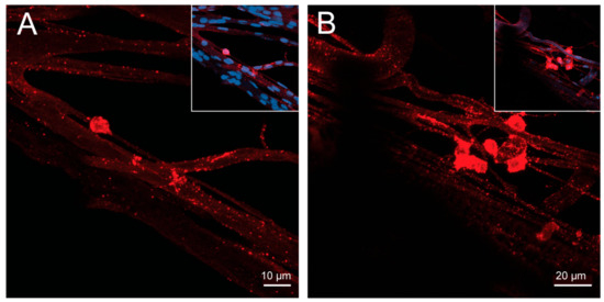 The phalloidin-tetramethylrhodamine B isothiocyanate conjugate (Sigma-Aldrich, Oakville, ON, Canada) was used as previously described [32] to stain F-actin in the muscle fibers. The male reproductive systems were fixed in 4% formaldehyde and diluted in a phosphate-buffered saline (PBS: 6.6 mM Na2HPO4/KH2PO4, 150 mM NaCl, pH 7.4) overnight at 4 °C. After three washes using PBS, the tissues were incubated with phalloidin-Cy3 (1:330 dilution in PBS) at room temperature for 45 min. The tissues were then washed in PBS and mounted on slides with one drop of Fluoroshield (Sigma-Aldrich, ON, Canada) to be viewed on a Zeiss laser scanning confocal microscope LSM 800 using the LSM image browser software (Carl Zeiss, Jena, Germany).
